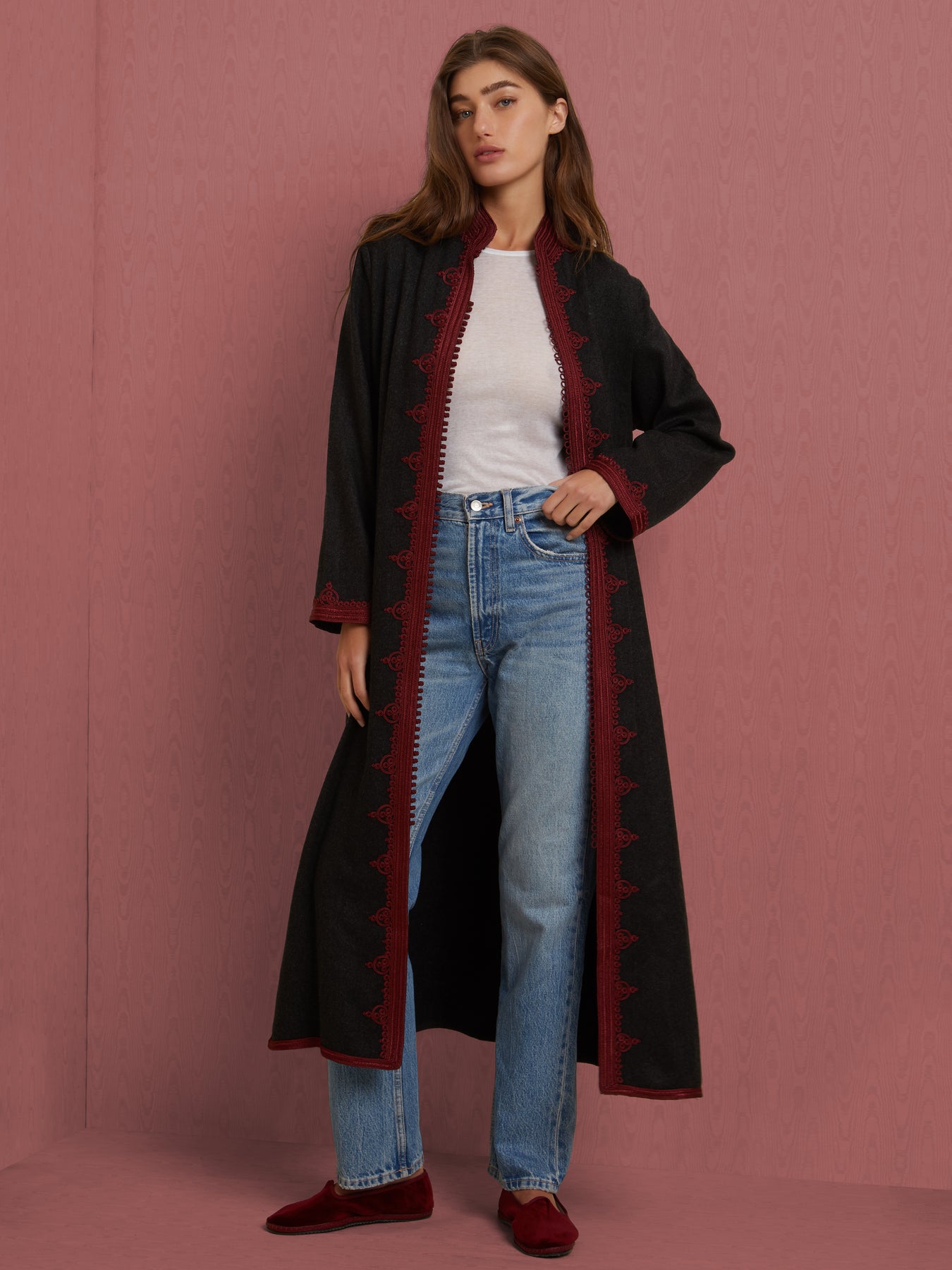 This traditional embellished coat is made in cashmere by artisans in Marrakech. Embroidered in contrasting or ton-sur-ton colors, these tailored coats can be worn to complete an elegant look or to give a touch of Bohemian to any casual attire. Their distinctive traits are Mandarin collars, Moroccan ornamental covered fastenings and oriental patterns.