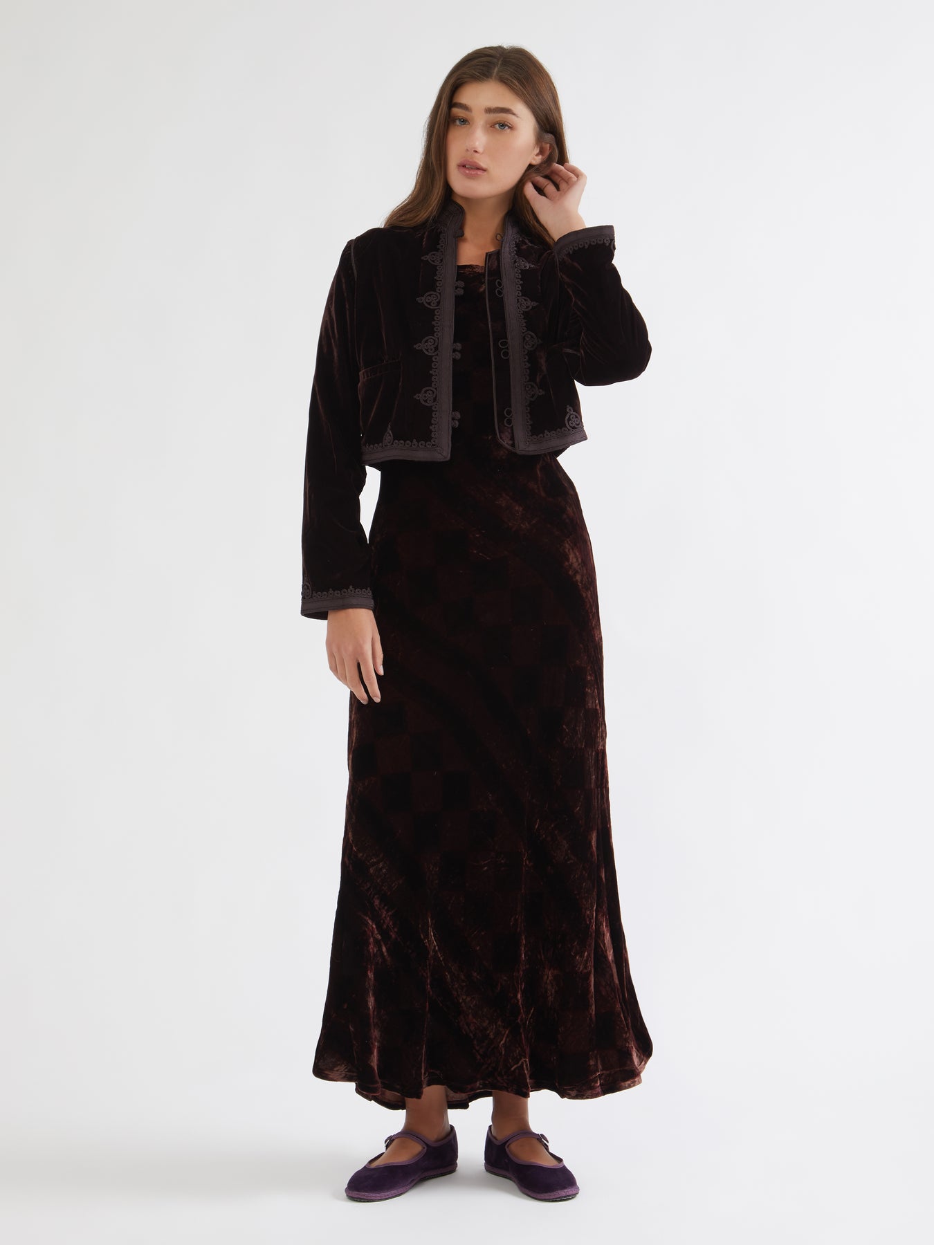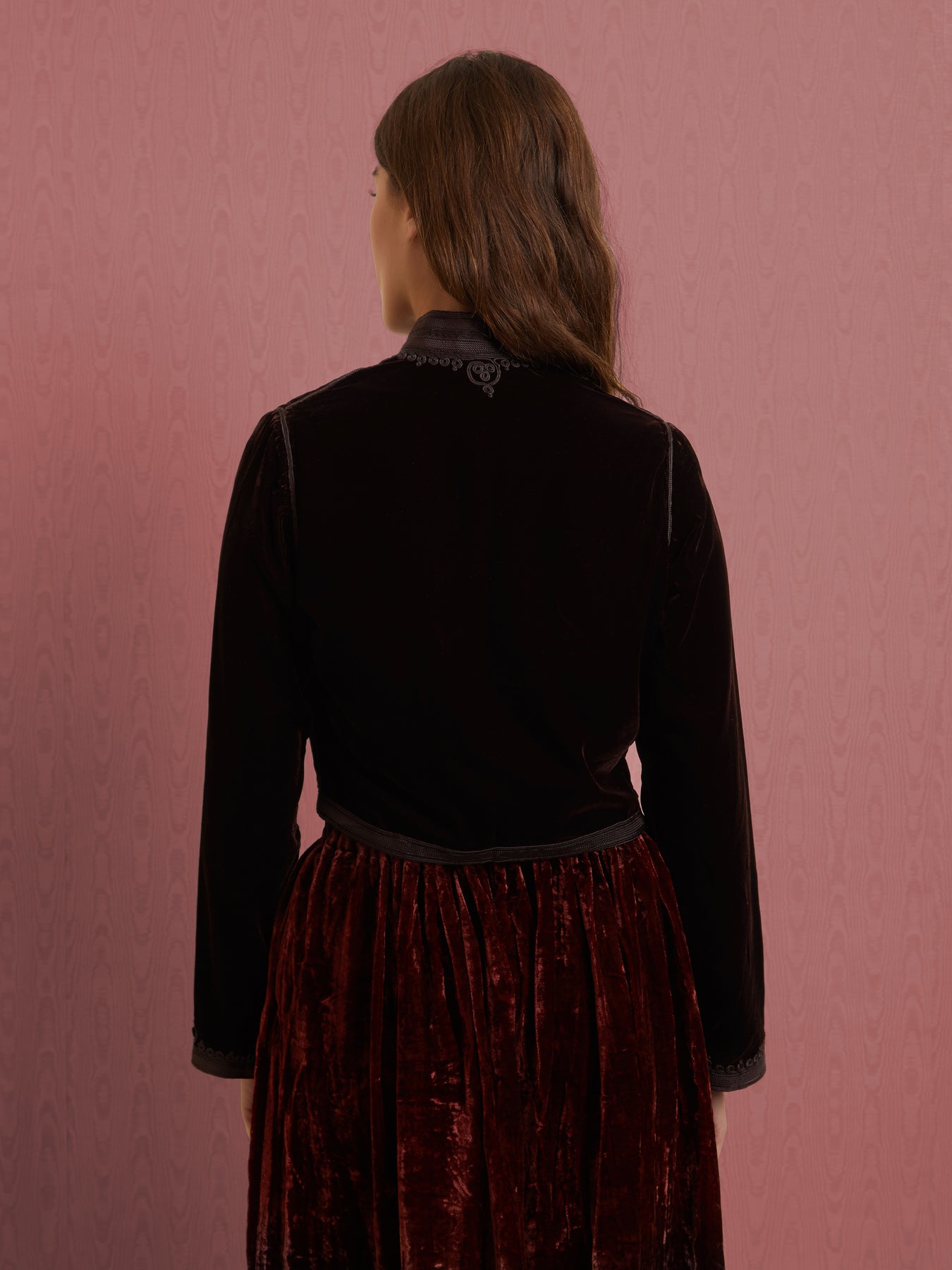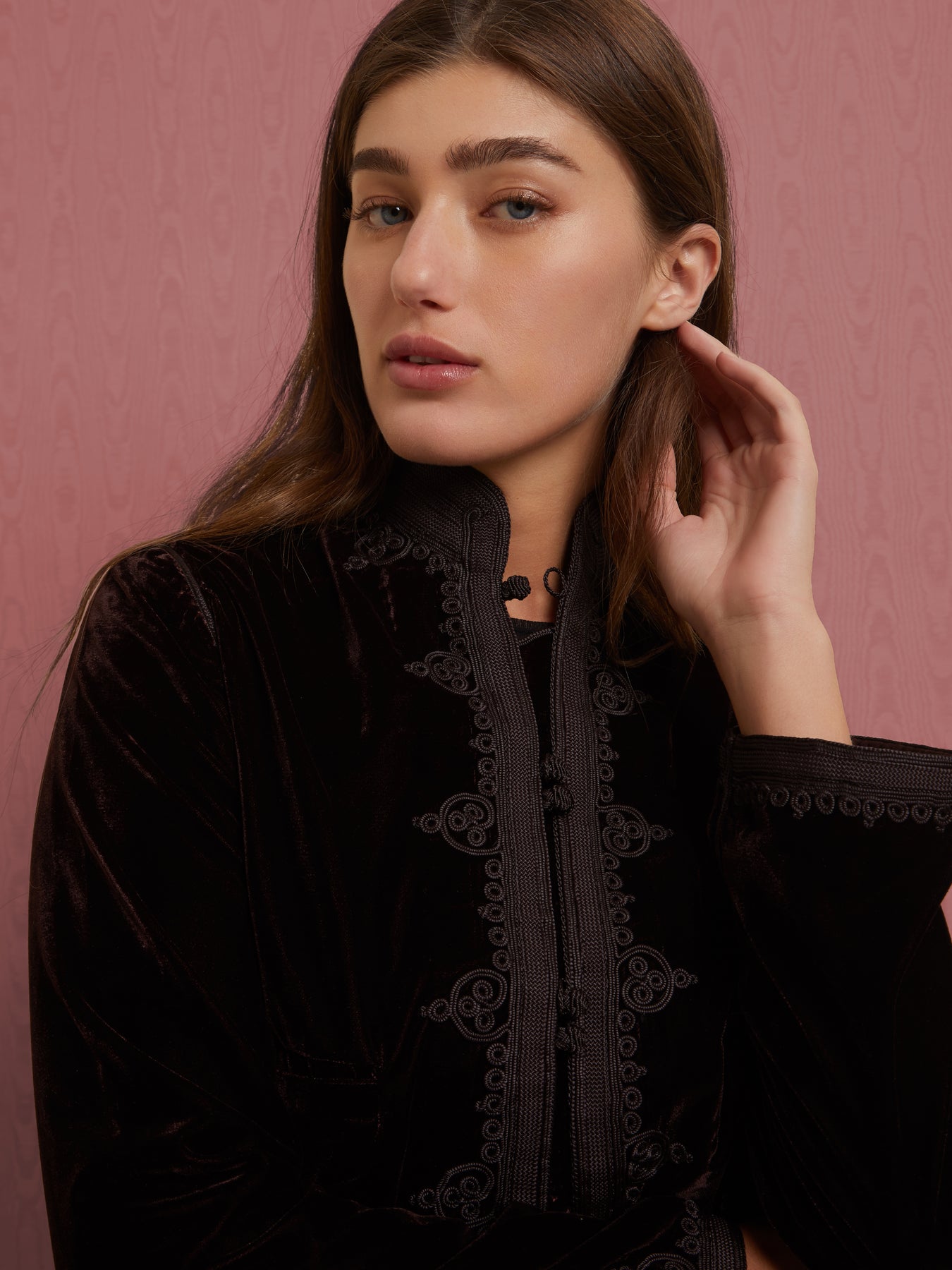 This traditional embellished bolero is made in velvet by artisans in Marrakech. Embroidered in ton-sur-ton colors, this cropped jacket can be worn to complete an elegant look or to add a touch of Bohemian flair to any casual outfit. Its distinctive features include a Mandarin collar, Moroccan ornamental covered fastenings, and oriental-inspired patterns