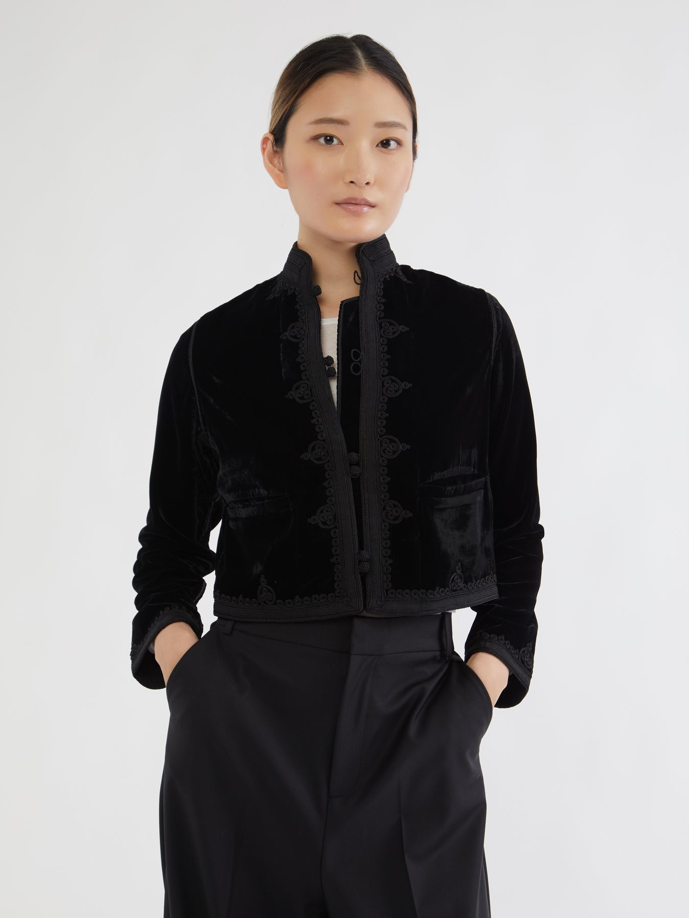 This traditional embellished bolero is made in velvet by artisans in Marrakech. Embroidered in ton-sur-ton colors, this cropped jacket can be worn to complete an elegant look or to add a touch of Bohemian flair to any casual outfit. Its distinctive features include a Mandarin collar, Moroccan ornamental covered fastenings, and oriental-inspired patterns