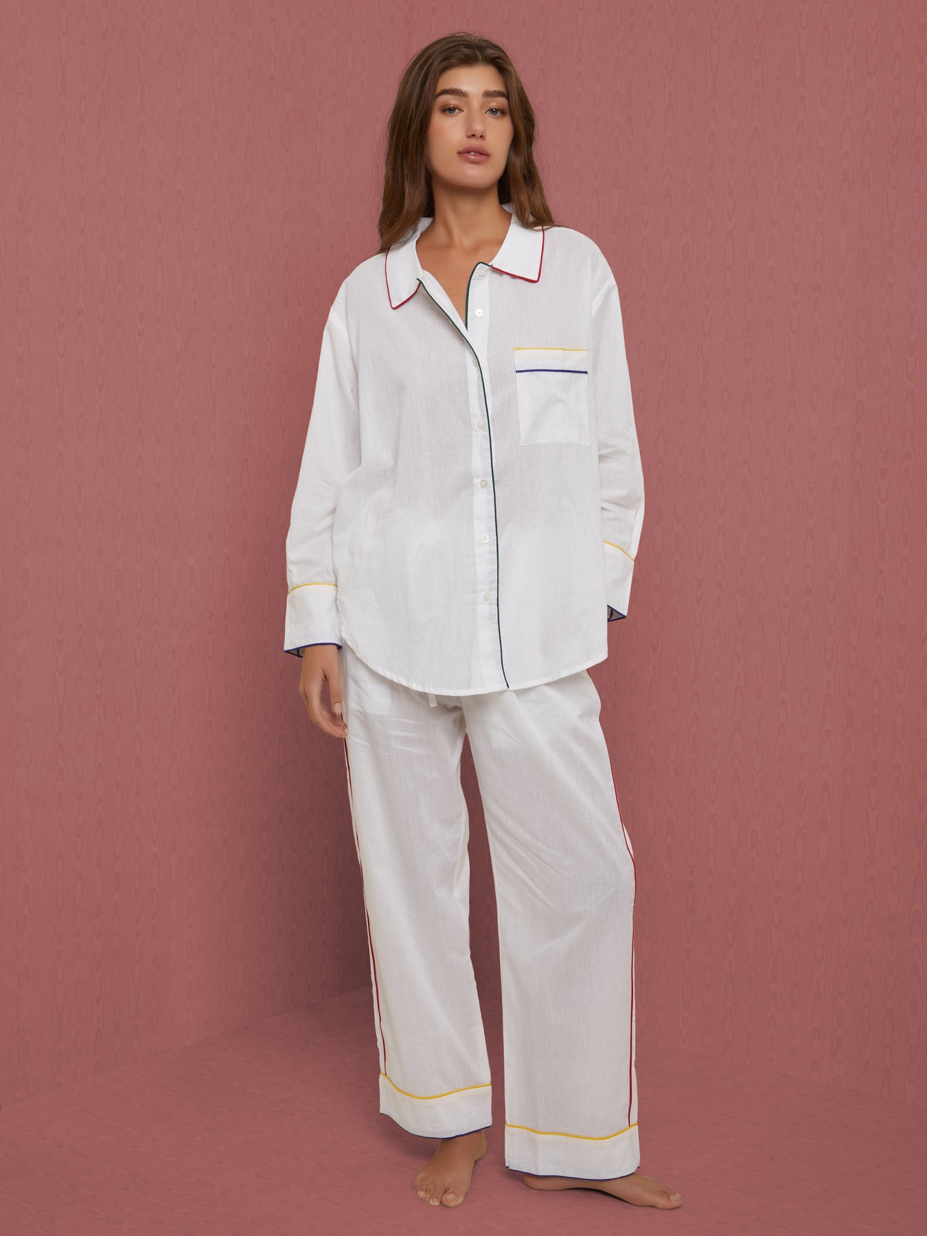 Set of cool and lightweight cotton pajama with colorful block print patterns handmade in India using ancient techniques. Its oversized fit gives a relaxed mood with wide leg and full-length button front. Detailed with colored piping along the seams, pockets at the sides and an elasticated waist with adjustable cord. It comes a with a lovely coordinated pouch to carry always in your holiday bag!