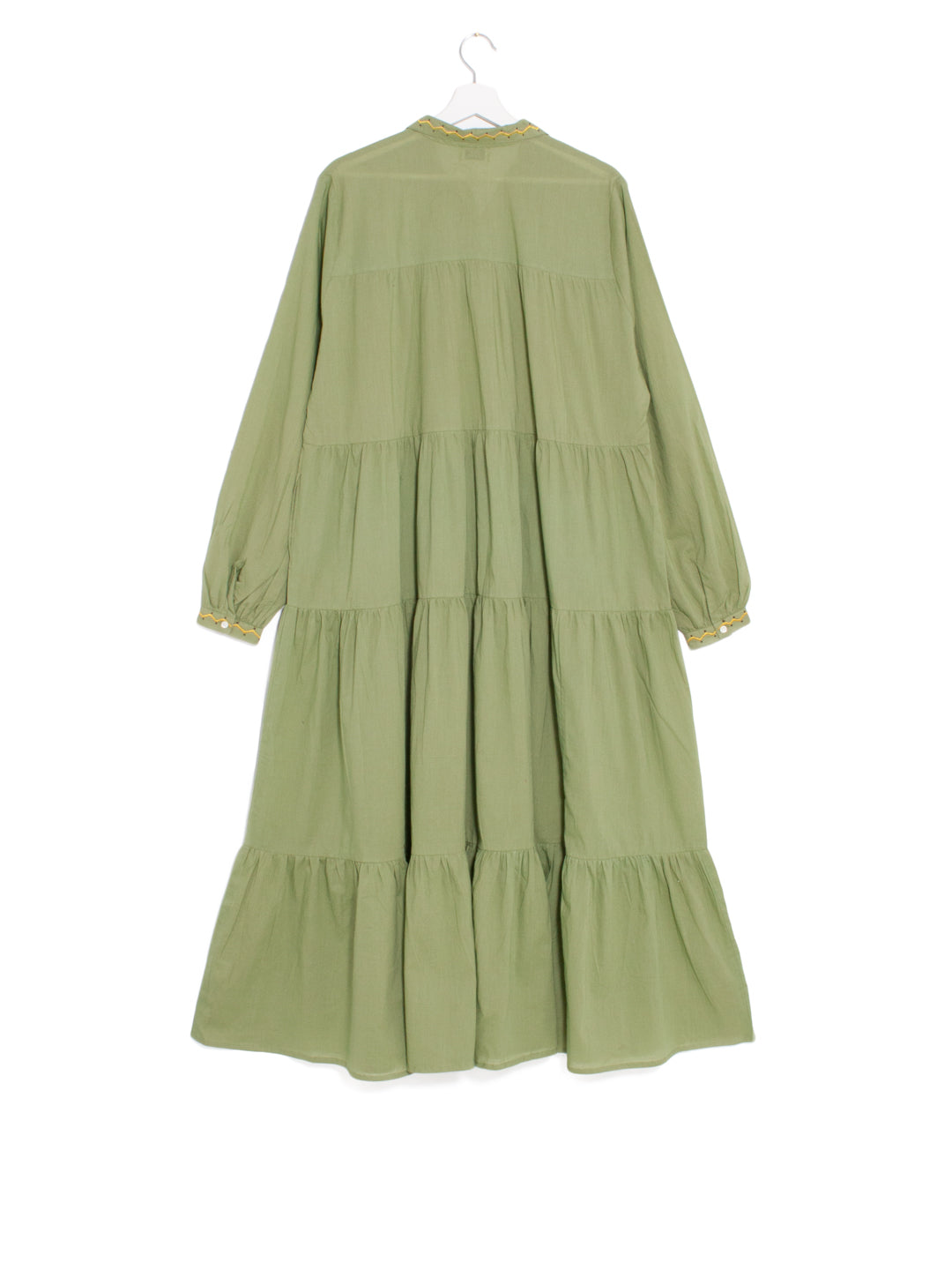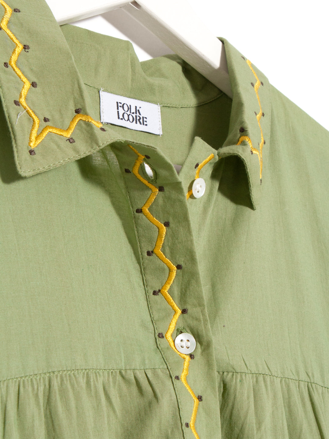 The Indian Cotton dress is made of 100% cotton, hand dyed by traditional craftsmen in India. This panel model is carefully embellished with a playful zig-zag embroidery in contrasting colors to highlight its classic shirt collar and the half button-down front. Use yours for every occasion- from day to night and pair it with the always-perfect Spanish Velvet Espadillas.