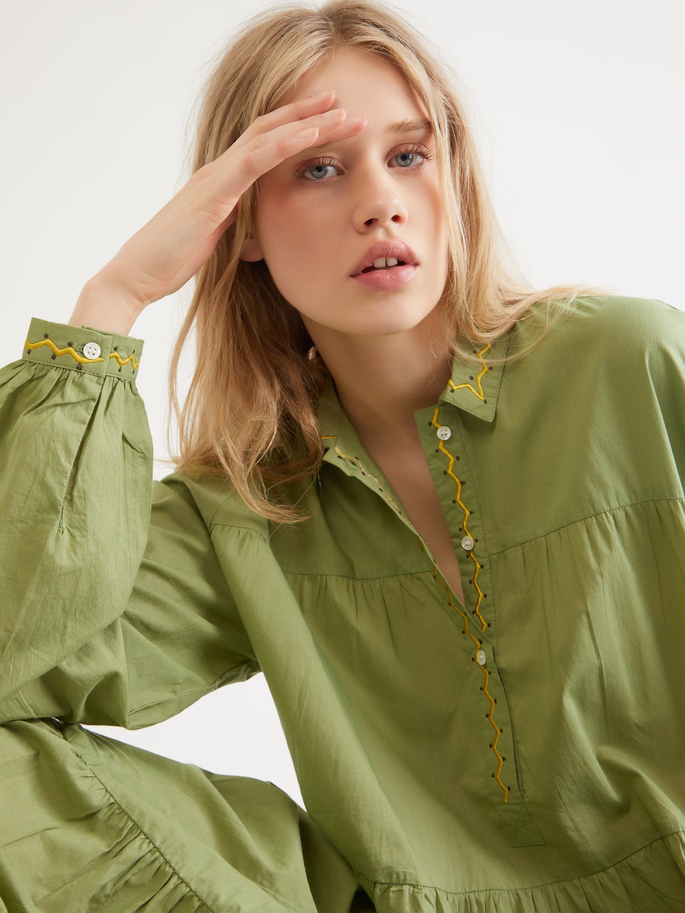 • Green with yellow and brown embroidery