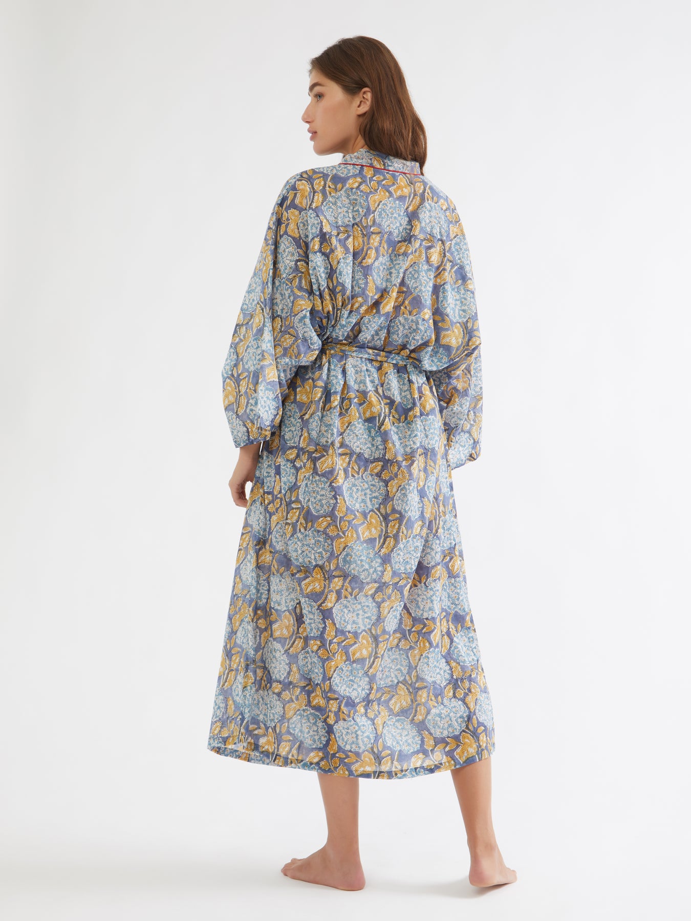 Unique cotton block-printed dressing gown, handmade in India by the local artisans. Refined with a belt and pockets, pack your nightgown for an exotic trip or wear it in the comfort of your own city home at winter time!