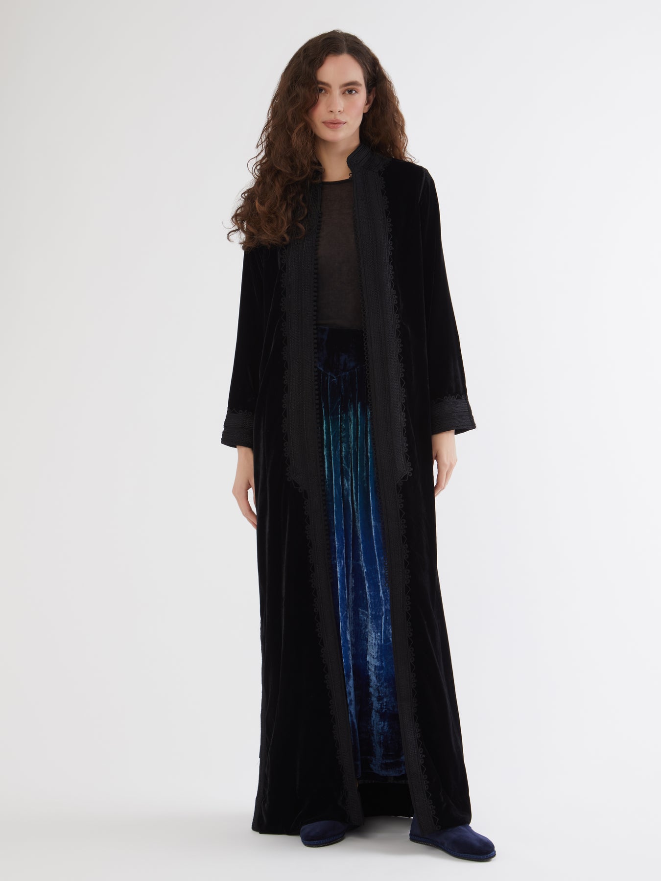 This traditional embellished robe is made in silk velvet by artisans in Marrakech. Embroidered in contrasting or ton-sur-ton colors, these tailored robes can be worn to complete an elegant look or to give a touch of Bohemian to any casual attire. Their distinctive traits are Mandarin collars, Moroccan ornamental covered fastenings and oriental patterns.